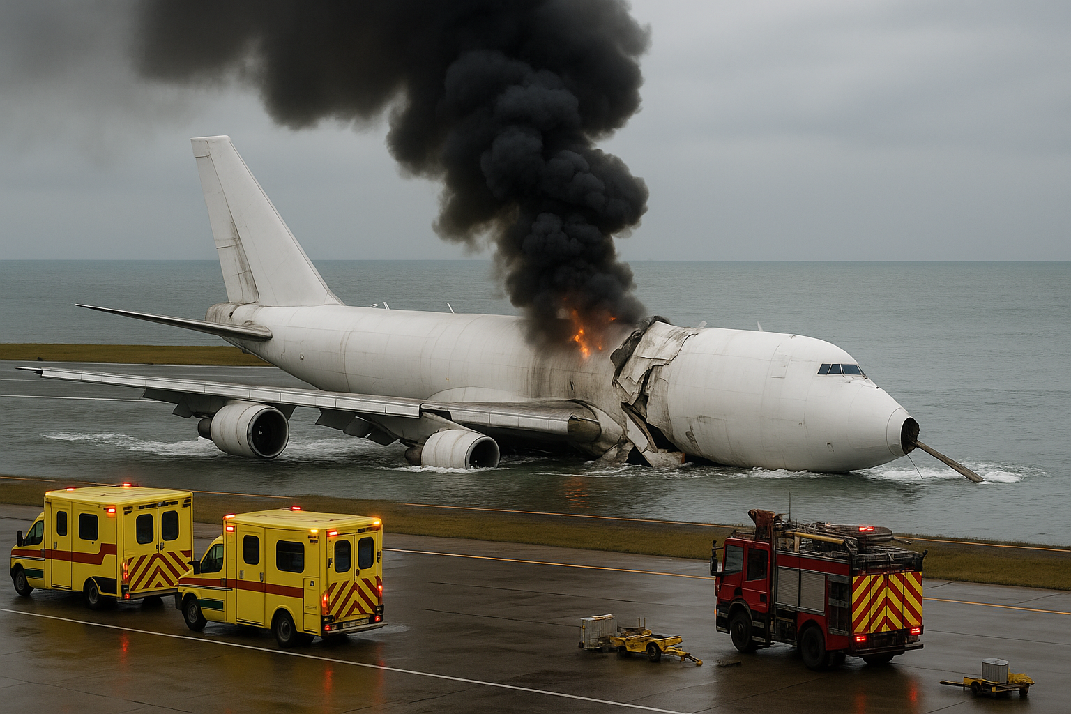 The aircraft skidded off the runway, broke through the perimeter fencing, and crashed into a patrol vehicle travelling along a service road parallel to the runway before plunging into the sea.