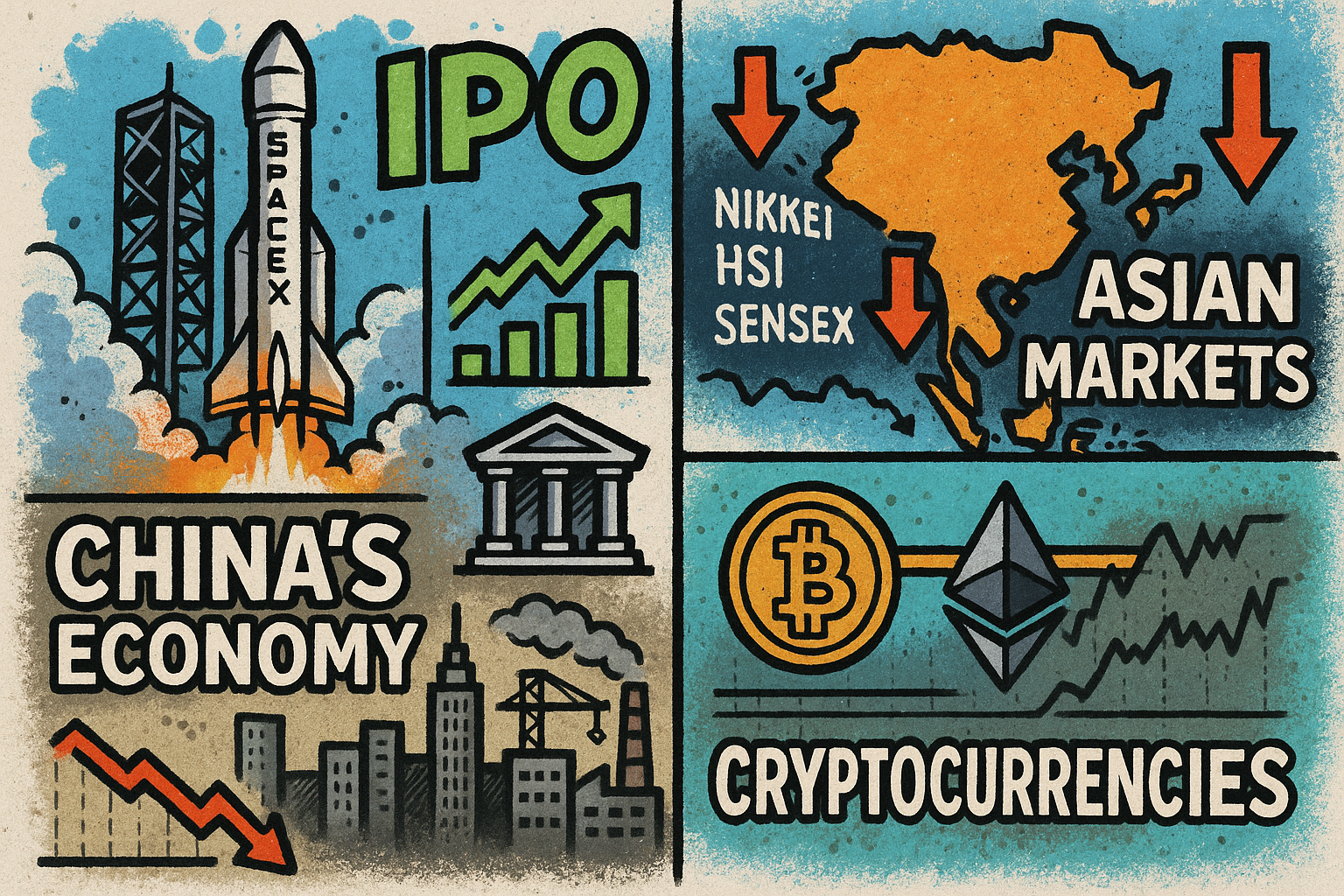 Global markets opened the week digesting a mix of corporate, macroeconomic, and asset-class developments, from early steps toward a potential SpaceX initial public offering to renewed signs of weakness in China’s economy, cautious trading in Asian equities, and tentative stabilisation in cryptocurrency markets.